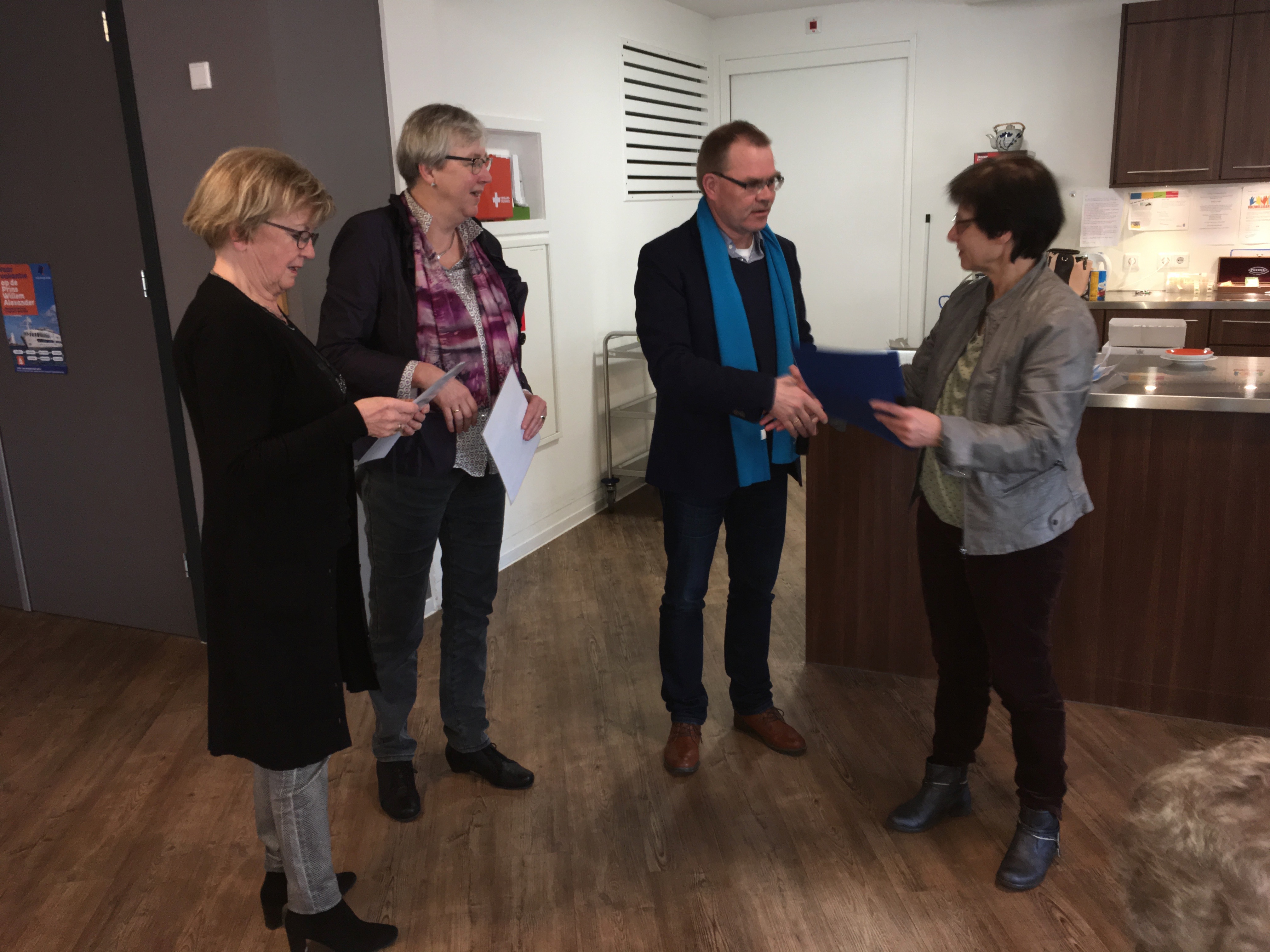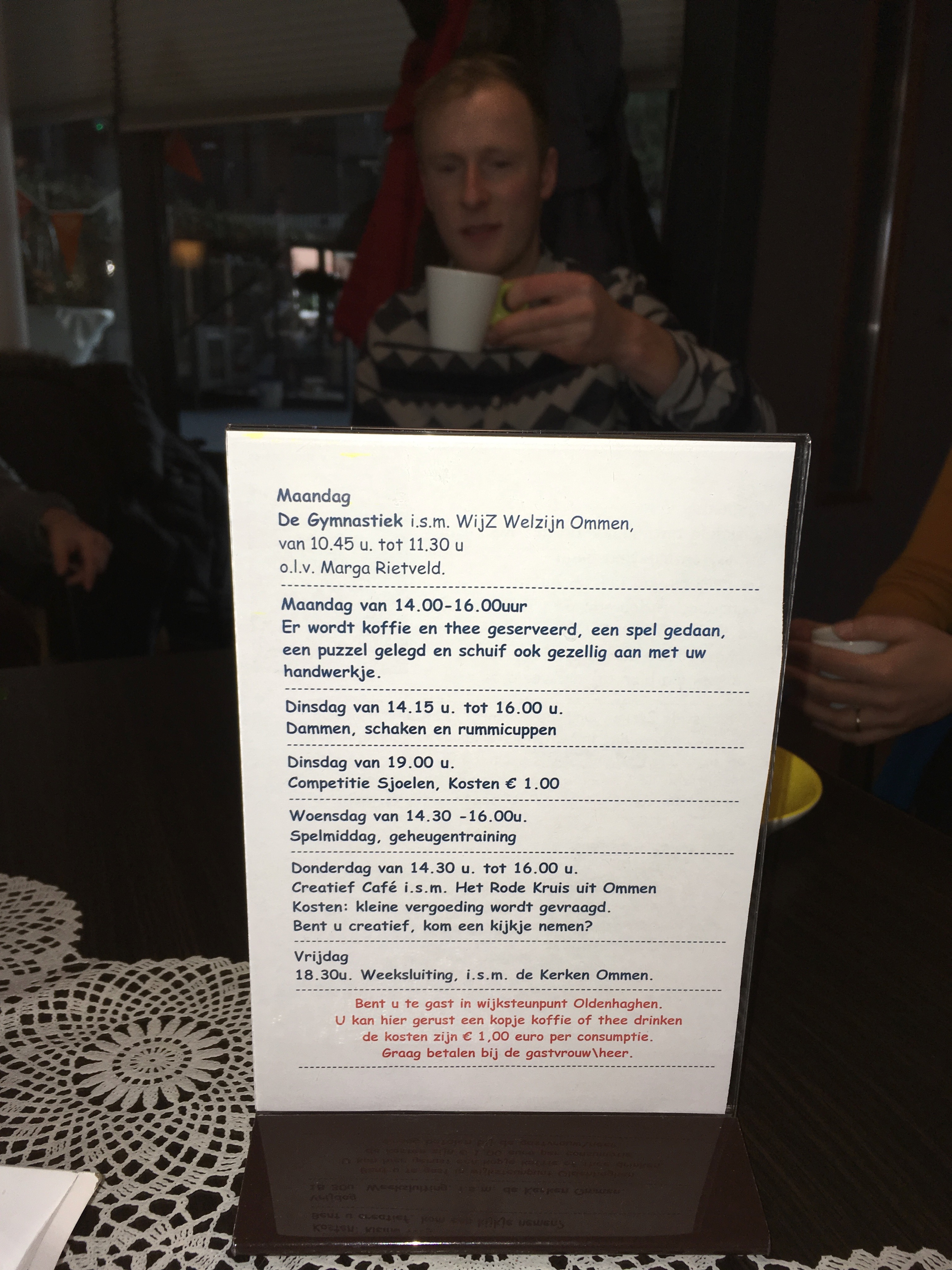 We werden gastvrij ontvangen door Ineke Otten lokatiemanager van wijksteunpunt Oldenhaghen en haar team bestaande uit 12 vaste krachten en een groot aantal vrijwilligers. Oldenhaghen fungeert naast wijksteunpunt ook als beschutte woonvorm voor 65 ouderen. Deze groep mensen zijn vanwege fysieke en cognitieve beperkingen beter af in deze woonvorm waar hen goede zorg wordt geboden. Tevens geeft dit centrum steun aan bewoners van een groot aantal aanleunwoningen.